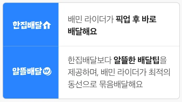 한번의 가입으로 한집배달과 알뜰배달, 두 가지 배달방식을 함께 제공할 수 있어요.