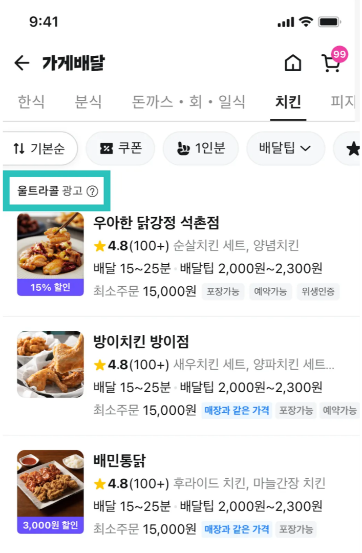 울트라콜(깃발광고)을 이용하는 가게는 가게배달 지면의 각 카테고리에서 확인할 수 있어요.